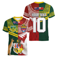 Custom Mate Ma'a Tonga and Australia Kangaroo Women V-Neck T-Shirt Nation Seal with Mascot Aboriginal and Tongan Kupesi Ngatu Art