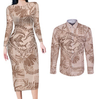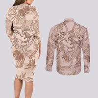 Hawaii Father's Day Vintage Lei Couples Matching Long Sleeve Bodycon Dress and Long Sleeve Button Shirt Hauoli la Makuakane - Beige