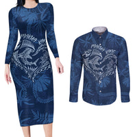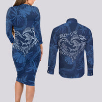 Hawaii Father's Day Vintage Lei Couples Matching Long Sleeve Bodycon Dress and Long Sleeve Button Shirt Hauoli la Makuakane - Blue