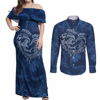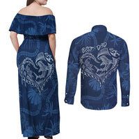Hawaii Father's Day Vintage Lei Couples Matching Off Shoulder Maxi Dress and Long Sleeve Button Shirt Hauoli la Makuakane - Blue
