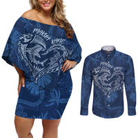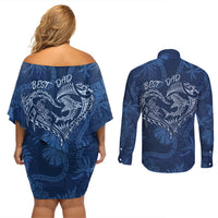 Hawaii Father's Day Vintage Lei Couples Matching Off Shoulder Short Dress and Long Sleeve Button Shirt Hauoli la Makuakane - Blue