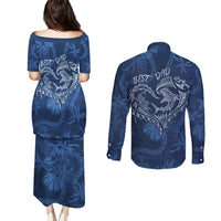 Hawaii Father's Day Vintage Lei Couples Matching Puletasi and Long Sleeve Button Shirt Hauoli la Makuakane - Blue