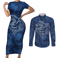 Hawaii Father's Day Vintage Lei Couples Matching Short Sleeve Bodycon Dress and Long Sleeve Button Shirt Hauoli la Makuakane - Blue