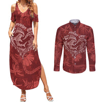 Hawaii Father's Day Vintage Lei Couples Matching Summer Maxi Dress and Long Sleeve Button Shirt Hauoli la Makuakane - Red