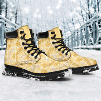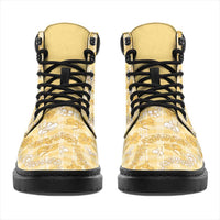 These boots aren’t just footwear — they’re a statement. Designed for those who want all-day comfort, bold style, and sustainable craftsmanship, Polynesian Pride Melemele Aloha Hawaii All Season Boots Plumeria Lei With Palaka Motif brings durability and originality together in one pair of custom-made boots.