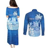 Personalised Bula Fiji Couples Matching Puletasi and Long Sleeve Button Shirt Fijian Masi Pattern With Blue Coat Of Arms
