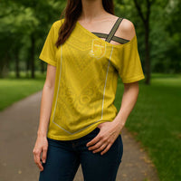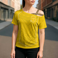 Turn heads and express your unique style with the Custom Niue Rugby Cross Shoulder Shirt Hiapo Tribal Motifs Sporty Style from Polynesian Pride. Perfect for casual outings, festivals, or making a fashion statement, this custom-made cross shoulder shirt combines high-end craftsmanship with eye-catching design.