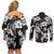 Hawaiian-Polynesian Art Tattoo Couples Matching Off Shoulder Short Dress and Long Sleeve Button Shirt Hibiscus and Plumeria Grayscale LT03